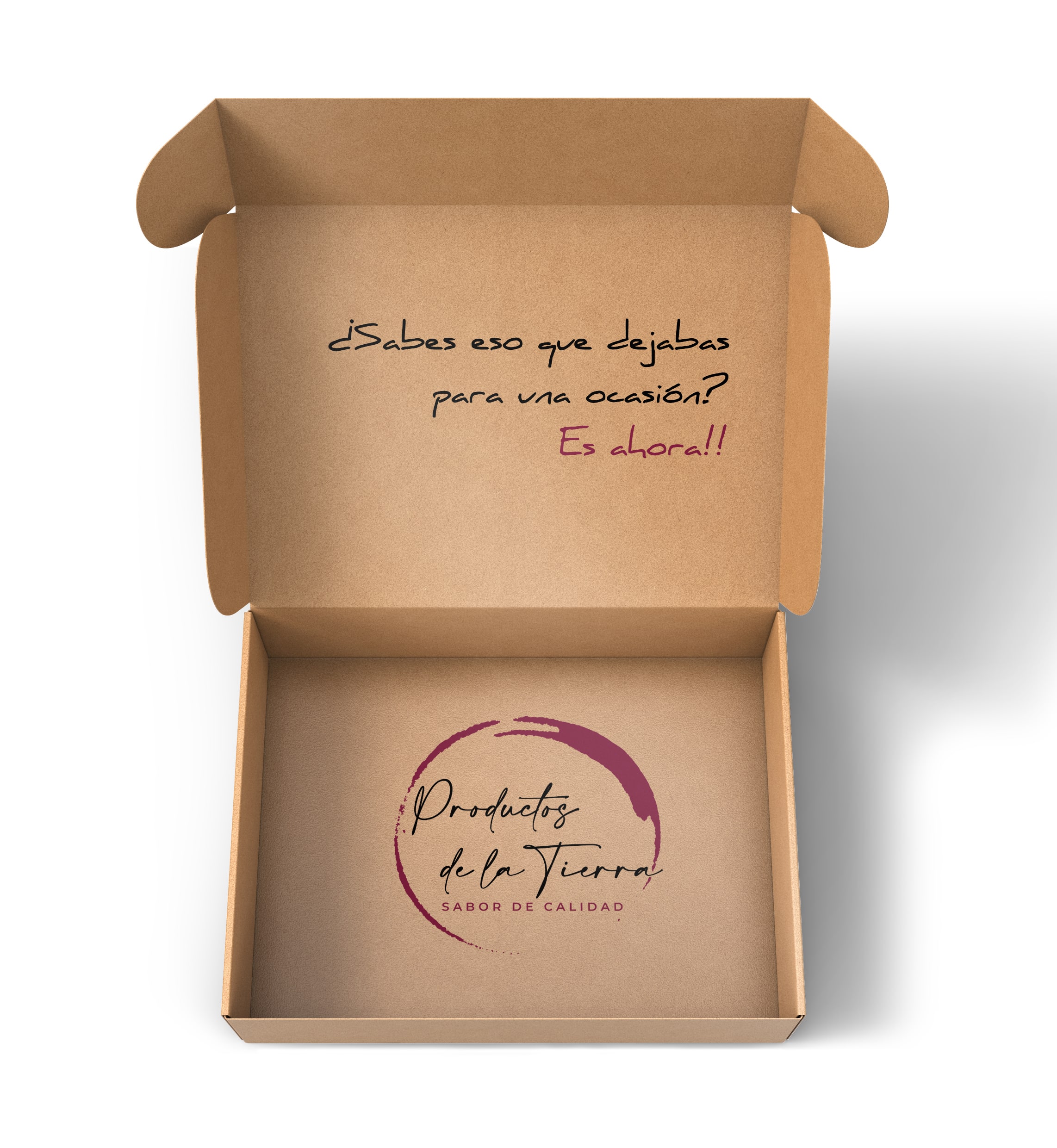 Caja cartón Kraft con logo Productos de la Tierra serigrafiado en color plata de 35 x 35 x 11 cm,  interior lecho de tiras de papel, decoración y dedicatoria  impresa en papel kraft reciclado .