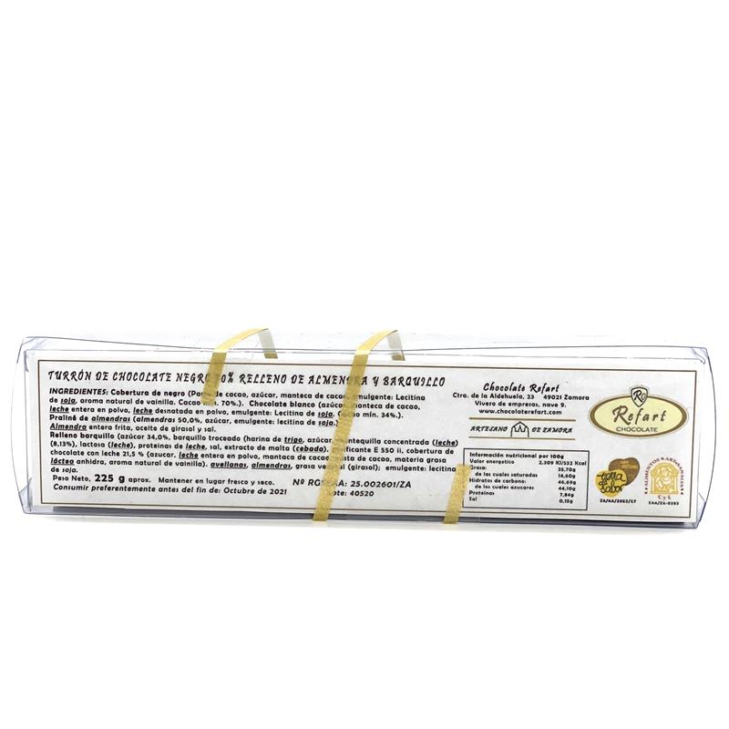 Turrón de chocolate negro 70% relleno de almendra y barquillo, con almendras enteras entre capas.